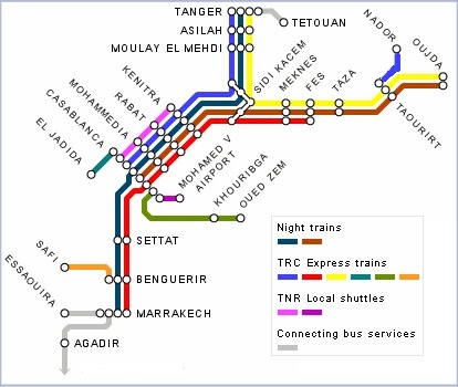 connects Tangier to Marrakech via Rabat and Casablanca, and Rabat to Oujda via